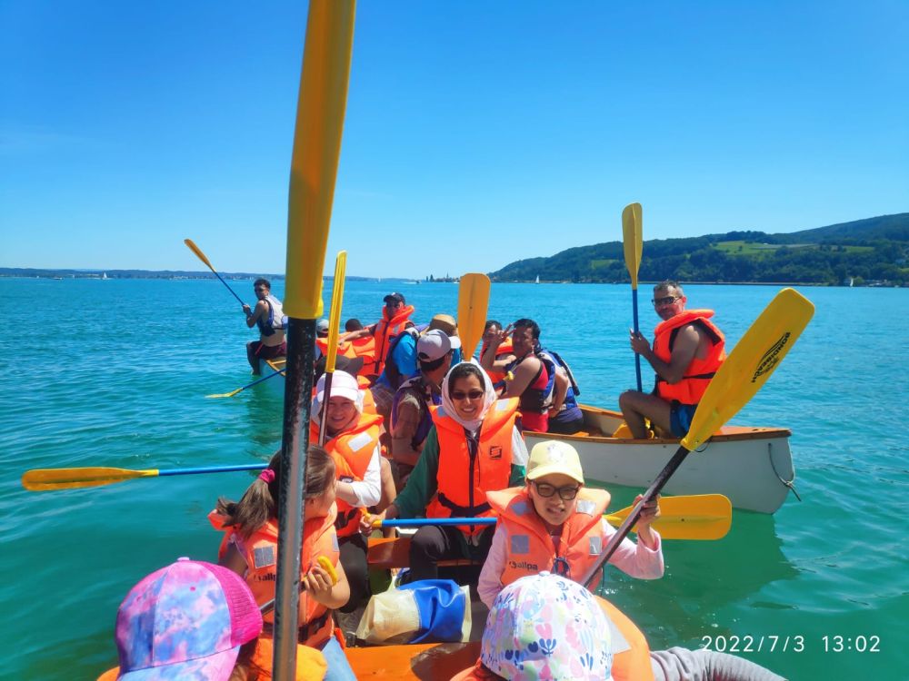 Nach einem kleinen Sonnenbad ging es dann in gleicher Besetzung weiter bis nach Gaienhofen. Mittlerweile waren die Teams aufeinander eingestellt und die anfängliche Unsicherheit hatte sich gelegt, sodass so mancher Spritzer absichtlich das andere Boot traf. Leider war die Rückfahrt viel zu schnell vorbei. Ein tolles Gruppenerlebnis das wir unbedingt wiederholen sollten.
